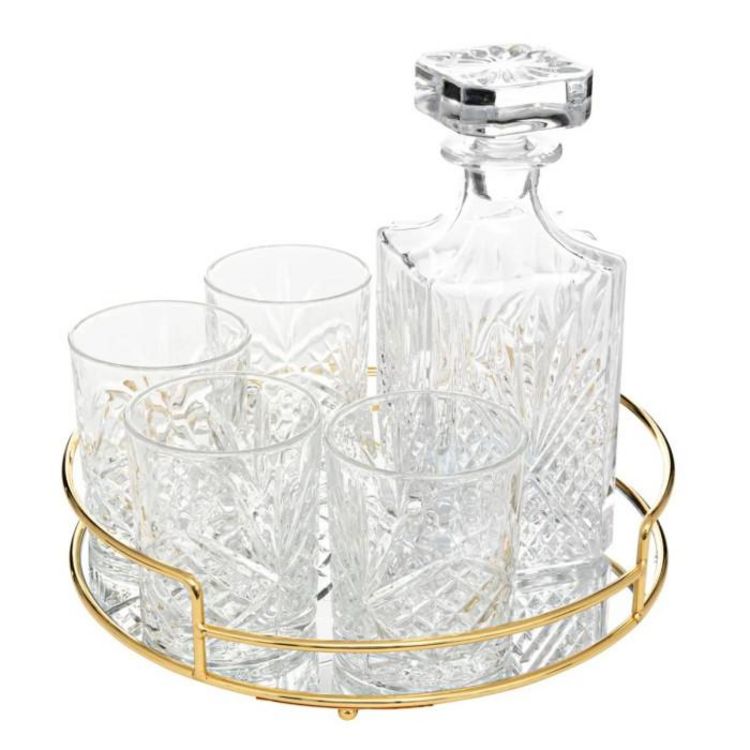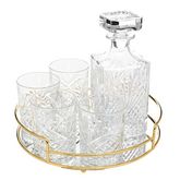 Informations Techniques : Dimensions : L. 22,5 x l. 9 x H. 9 cm Matière : Verre Spécificités : Pratique & Chic Coffret à Whisky Comprend : 1 carafe avec bouchon 4 verres 1 plateau Motif sculpté Plateau avec fond miroir Anse de transport en métal doré Forme ronde Poids : 3,30 kg Couleur : Transparen