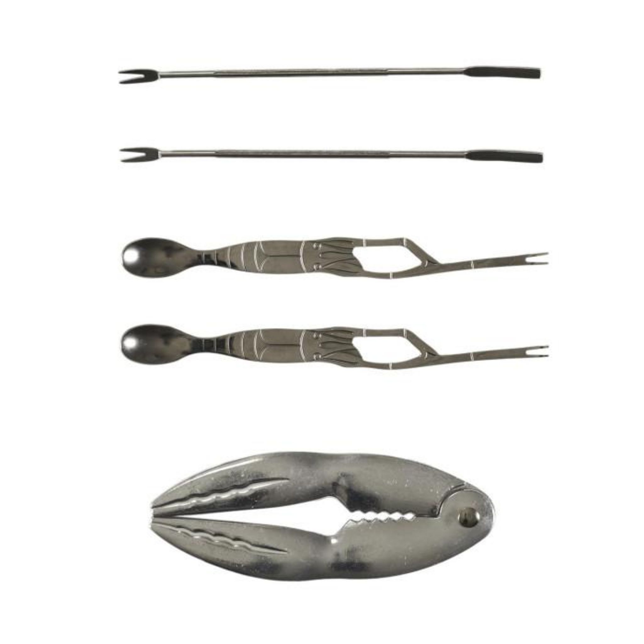 Informations Techniques : Dimensions : L. 20 x l. 6 x H. 3,5 cm Matière : 100% Acier inoxydable Spécificités : Pratique & Utile Coffret pour crustacés 2 fourchettes et 3 pinces Poids : 0,18 kg Couleur : Gris