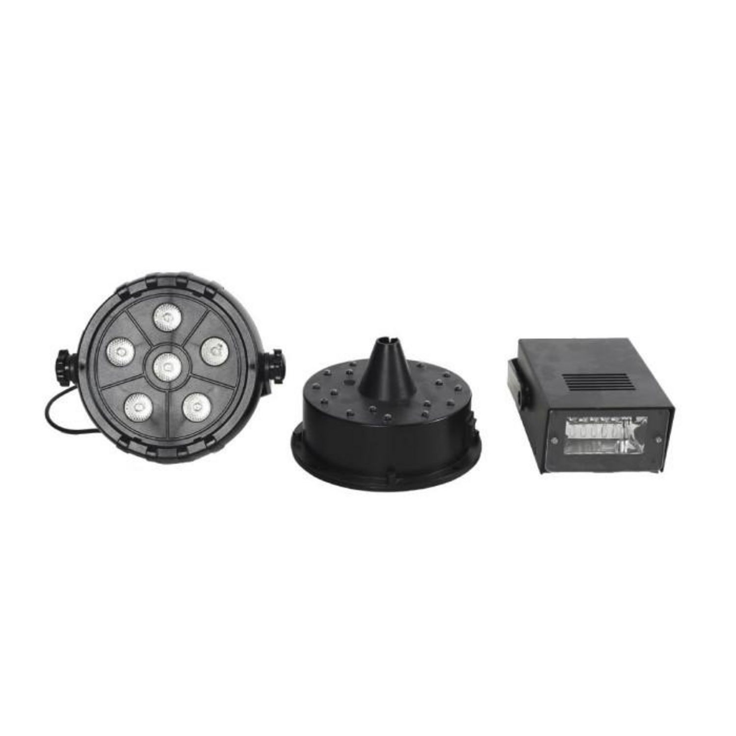 Informations Techniques : Dimensions : L. 14 x l. 14 x H. 15 cm Matière : Plastique Spécificités : Pratique & Festif Coffret disco 3 pièces Contient : Jeu de lumière LED (adaptateur secteur inclus) Boule disco support LED (piles AA LR6 non incluses) Stroboscope (piles AA LR6 non incluses) Poids : 0,