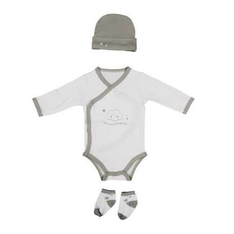 Informations Techniques : Dimensions : L. 4 x l. 24 x H. 24 cm Matières : Coton & Polyester Spécificités : Doux & Agréable Coffret Naissance pour Bébé Contient : 1 Body 1 Bonnet 1 Paire de Chaussettes Taille 0-3 Mois French Design Poids : 0,09 kg Couleur : Taupe & Blanc