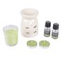 Contient 1 brûle parfum, 2 bougies chauffe-plat, 1 bougie verrine & 2 huiles