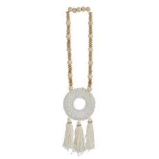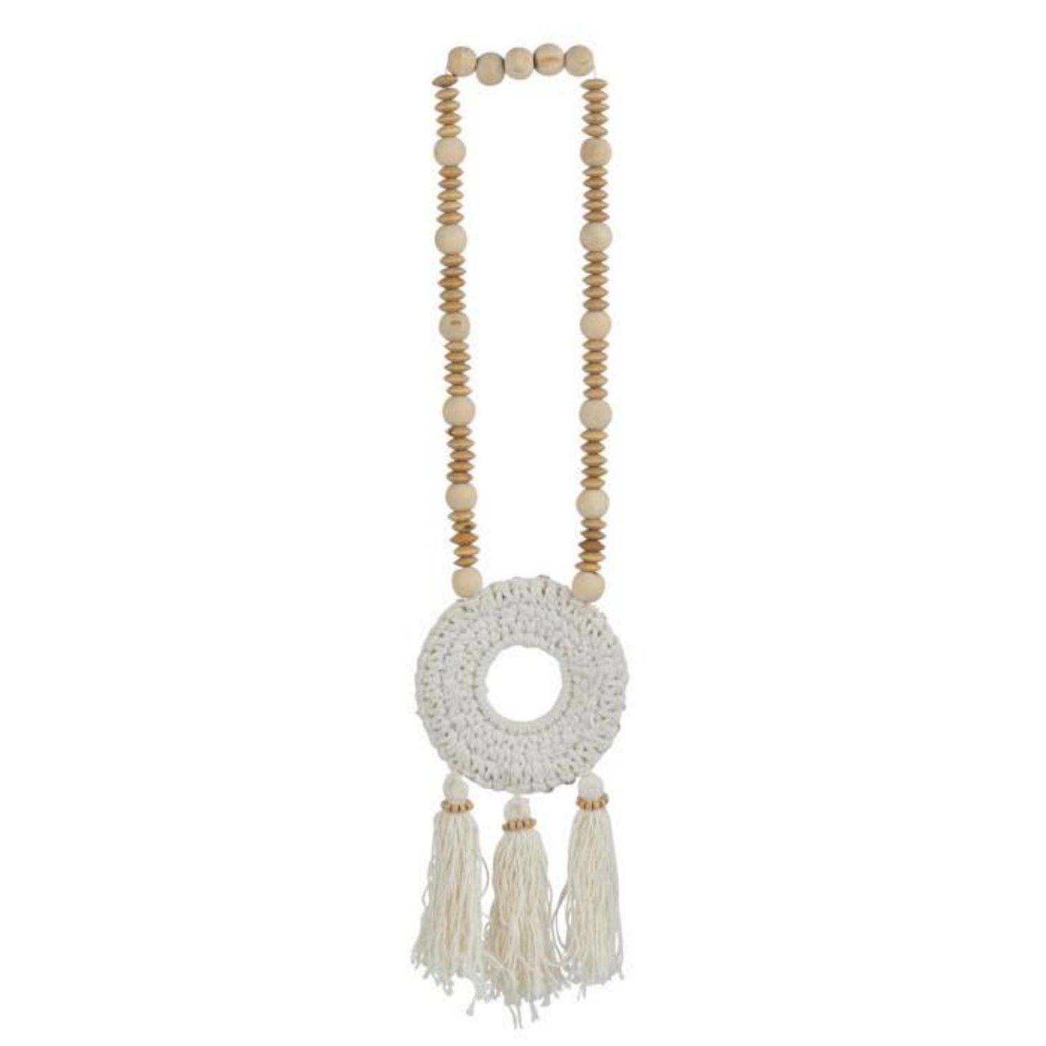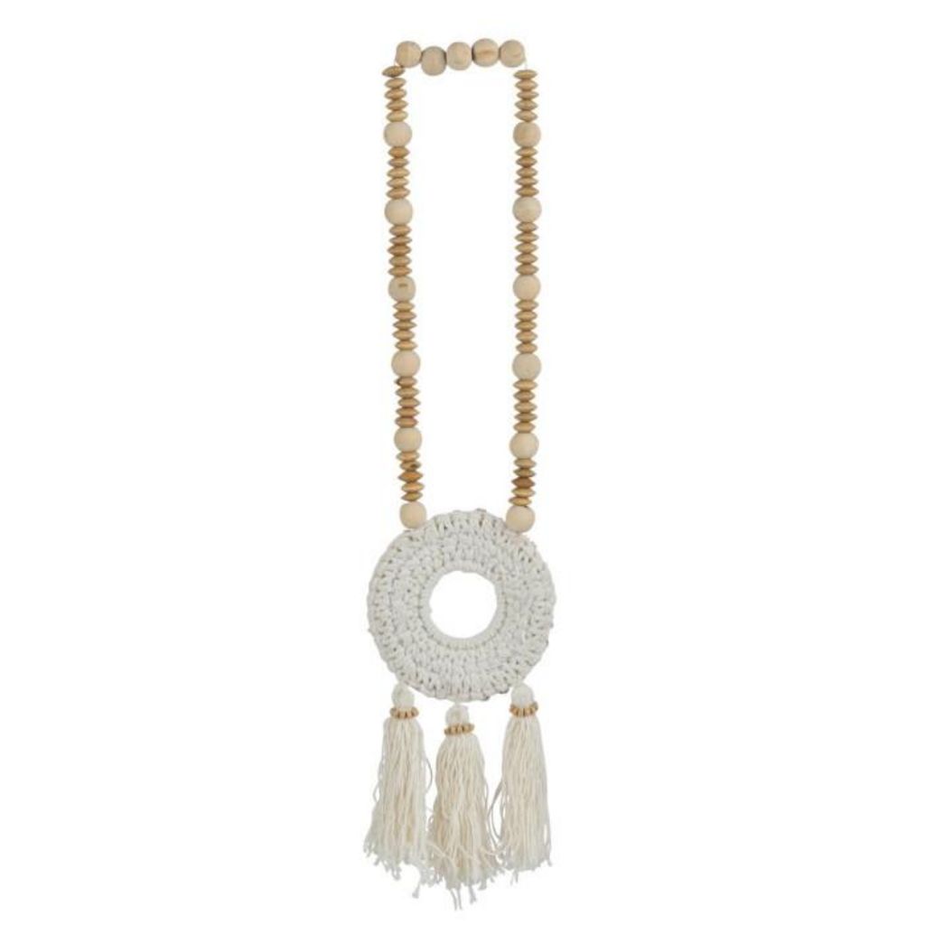 Informations Techniques : Dimensions : L. 15 x l. 3 x H. 60 cm Matières : 60% Coquillage, 30% Bois (Albasia) & 10% Coton Spécificités : Déco & Pratique Collier de coquillages À suspendre Avec pompons Poids : 0,24 kg Couleur : Blanc & Naturel