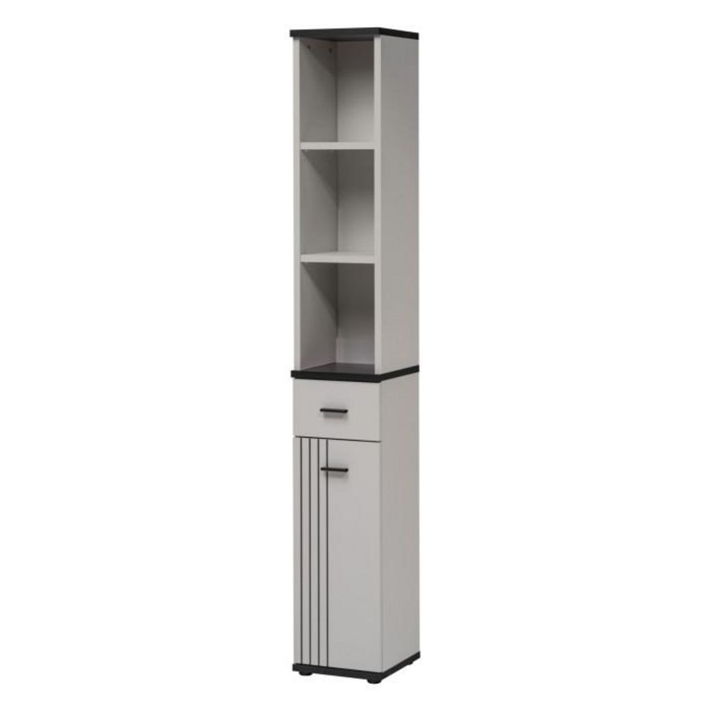 Informations Techniques : Dimensions : L. 30 x l. 32 x H. 203 cm Matière : MDF Spécificités : Fonctionnelle & Utile Colonne de rangement 3 espaces ouverts 1 tiroir et 1 porte Avec étagères intérieures Imprimé à rayures noires Finition mate Nombre de colis : 1 Poids : 29,10 kg Couleur : Gris & Noir