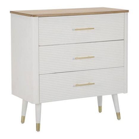 Informations Techniques : Dimensions : L. 78 x l. 37 x H. 80 cm Tiroirs : L. 67 x l. 29 x H. 17 cm Matière : Bois (Pin & Frêne), MDF & Métal Spécificités : Pratique & Robuste Commode design Avec 3 tiroirs Finitions dorées Poids : 23 kg Couleur : Blanc & Naturel