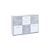 Informations Techniques : Dimensions : L. 115 x P. 30 x H. 77 cm Matière : Panneaux de particules (mélaminé) Spécificités : Design & Pratique Contient deux tiroirs et cinq portes Possède des glissières métalliques Entretien facile Effet béton Label environnemental : FSC Nombre de colis : 1 Poids : 3