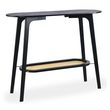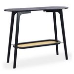 Informations Techniques : Dimensions : L. 100 x l. 35 x H. 80 cm Matière : Bambou Spécificités : Pratique & Utile Console design Plateau inférieur avec cannage Forme ovale Nombre de colis : 1 Poids : 6,1 kg Couleur : Noir & Naturel