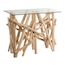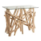 Informations Techniques : Dimensions : L. 97 x l. 47 x H. 77,5 cm Matières : 90% Bois (Eucalyptus) & 10% Verre Spécificités : Tendance & Naturelle Console design Forme rectangulaire Poids : 20,75 kg Couleur : Naturel