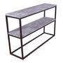 Informations Techniques : Dimensions : L. 110 x l. 30 x H. 70 cm Plateau : H. 2 cm Matières : Revêtement : MDF & Papier stratifié Piètement : Acier Spécificités : Intemporelle & Élégante Console design Avec 2 étagères Plateau imitation béton Revêtement en poudre Nombre de colis : 1 Poids max suppor