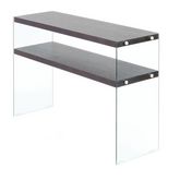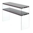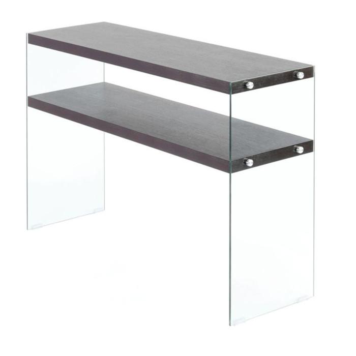 Informations Techniques : Dimensions : L. 110 x l. 32 x H. 75 cm Épaisseur Plateau : 3,8 cm Épaisseur Verre : 0,8 cm Matières : MDF & Verre Spécificités : Pratique & Moderne Console Design 2 Étagères Parallèles Uni Mat Grand Espace de Stockage Forme Rectangulaire Parois Latérales en Verre Transparen