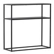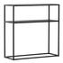Informations Techniques : Dimensions : L. 80 x l. 30 x H. 80 cm Plateau : H. 2 cm Matières : Verre & Acier Spécificités : Minimaliste & Élégante Console avec étagère Plateau en verre Revêtement en poudre époxy Nombre de colis : 1 Poids max supporté : 38 kg Poids : 7,5 kg Couleur : Noir