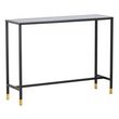 Informations Techniques : Dimensions : L. 100 x l. 30 x H. 75 cm Matières : Plateau : Verre Piètement : Acier Spécificités : Élégante & Moderne Console design Plateau en verre effet marbre Revêtement en poudre noir mat et laiton Nombre de colis : 1 Poids : 7,6 kg Couleur : Noir