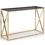 Informations Techniques : Dimensions : L. 120 x P. 40 x H. 78 cm Matières : Inox & Verre Spécificités : Plateau rectangulaire en verre fumé Couleur tendance Livré démonté Convient pour un usage intérieur Poids : 19,5 kg Nombre de colis : 1 Couleur : Or & Noir