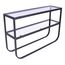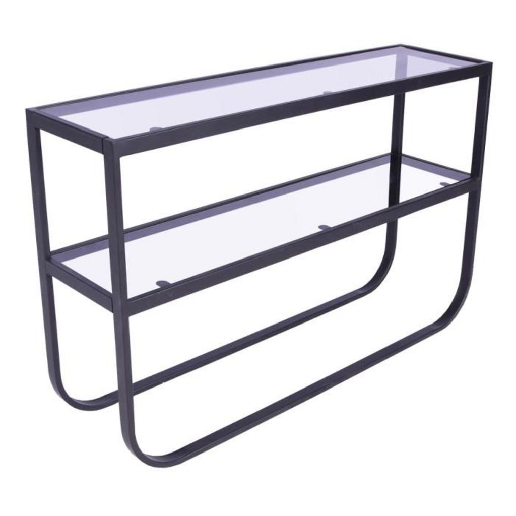 Informations Techniques : Dimensions : L. 110 x l. 30 x H. 70 cm Matières : Verre & Acier Spécificités : Élégante & Moderne Console design Plateau en verre Revêtement en poudre Nombre de colis : 2 Poids : 24,8 kg Couleur : Noir
