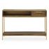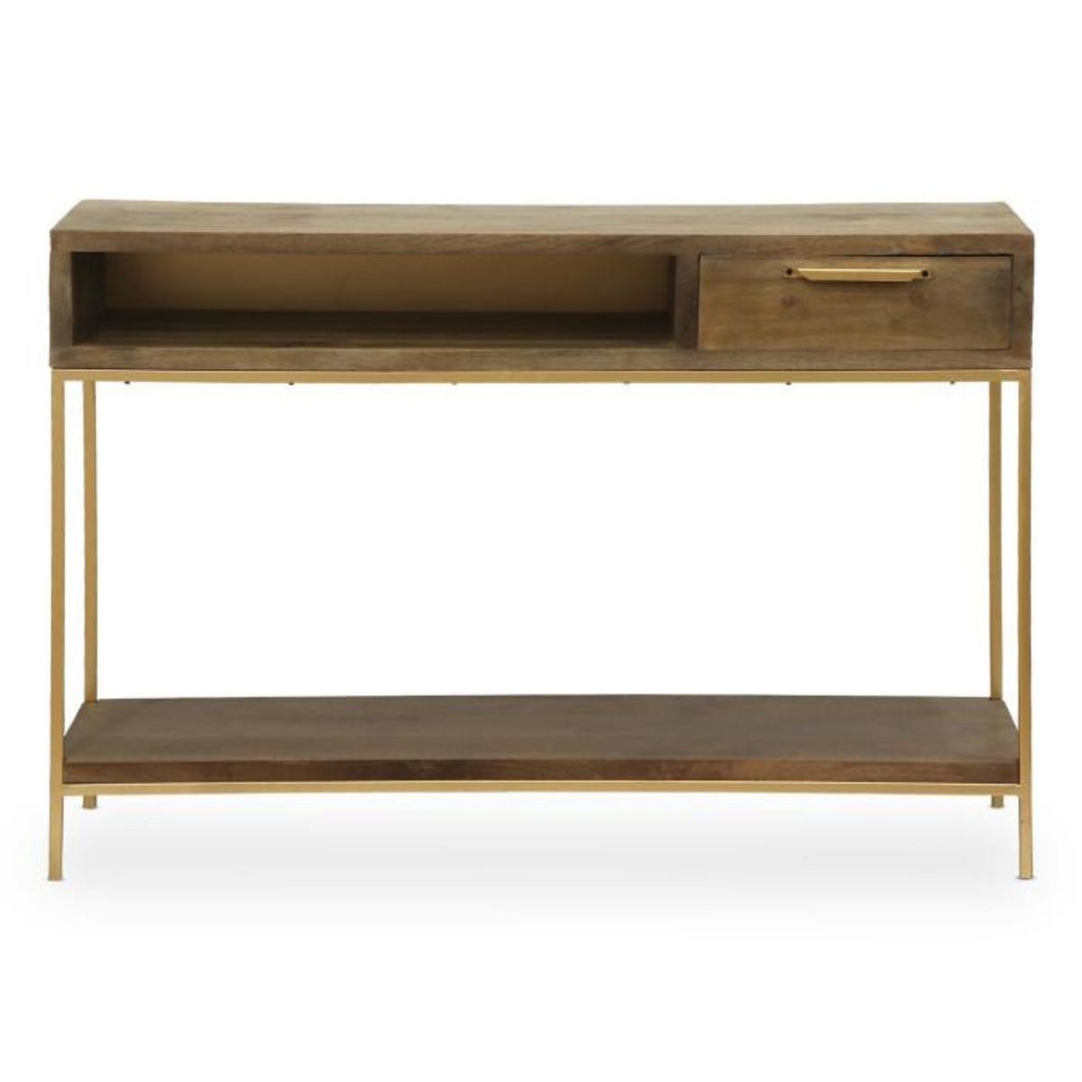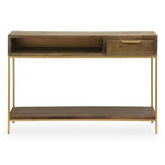 Informations Techniques : Dimensions : L. 120 x P. 34 x H. 80 cm Matières : Bois & Métal Spécificités : Tendance & Pratique Table Basse Design Forme Rectangulaire 1 Tiroir 1 Niche Montage facile avec outils fournis Nombre de colis : 1 Poids : 19 kg Couleur : Marron & Or