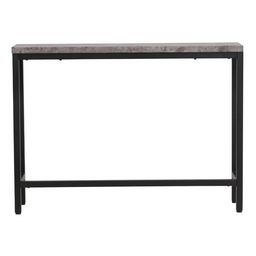 Informations Techniques : Dimensions : L. 110 x l. 30 x H. 80 cm Plateau : H. 3 cm Matières : Revêtement : MDF & Papier stratifié Piètement : Acier Spécificités : Intemporelle & Élégante Console design Plateau imitation béton Revêtement en poudre Nombre de colis : 1 Poids max supporté : 30 kg Poids