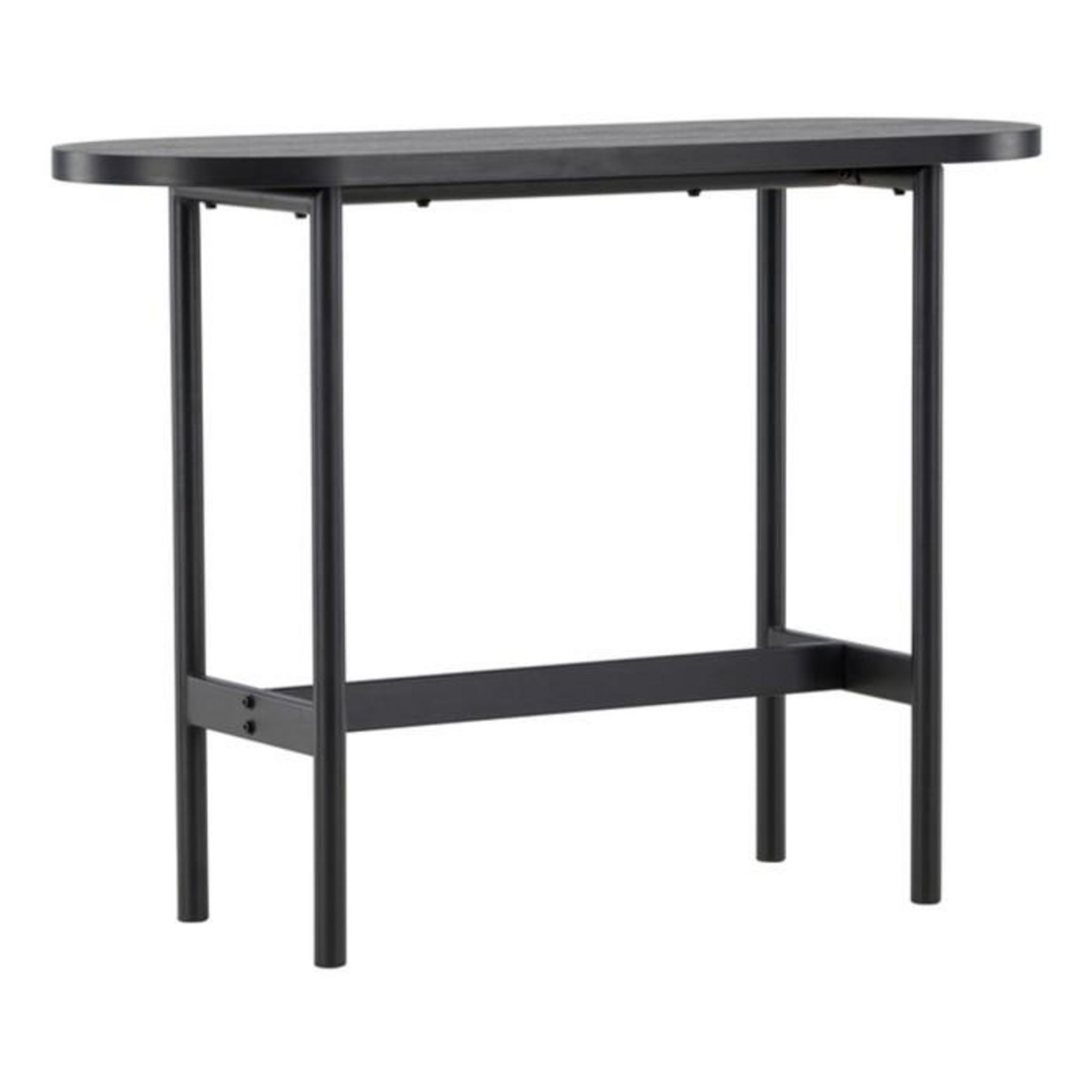 Informations Techniques : Dimensions : L. 110 x l. 40 x H. 80 cm Plateau : H. 3 cm Matières : Plateau : MDF Piètement : Acier Spécificités : Moderne & Robuste Console design ovale Revêtement piètement en poudre Nombre de colis : 1 Poids max supporté : 50 kg Poids : 14 kg Couleur : Noir