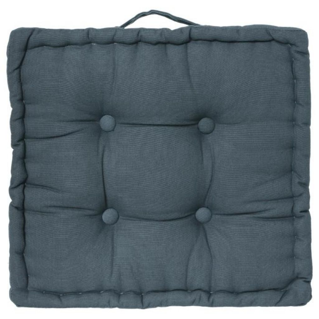 Informations Techniques : Dimensions : L. 40 x l. 40 x H. 8 cm Matière : 100% Coton Spécificités : Doux & Confortable Coussin de sol carré Design capitonné Avec poignée Poids : 0,51 kg Couleur : Bleu Orage