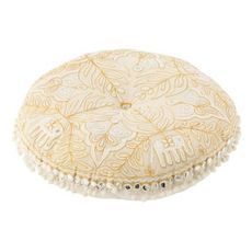 Informations Techniques : Dimensions : D. 50 x H. 15 cm Matière : 100% Coton Spécificités : Confortable & Déco Coussin de sol rond Motifs en relief Poids : 2 kg Couleur : Crème & Or