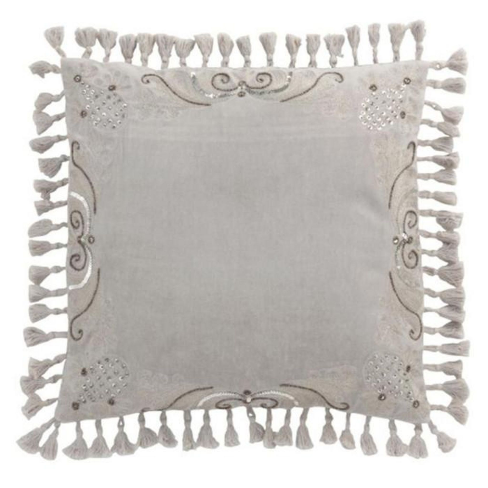 Informations Techniques : Dimensions : L. 45 x l. 45 cm Matière : Textile Spécificités : Tendance & Design Coussin déco Déhoussable Toucher Velours Style Marocain A Pompons Forme Carrée Poids : 0,76 kg Couleur : Gris