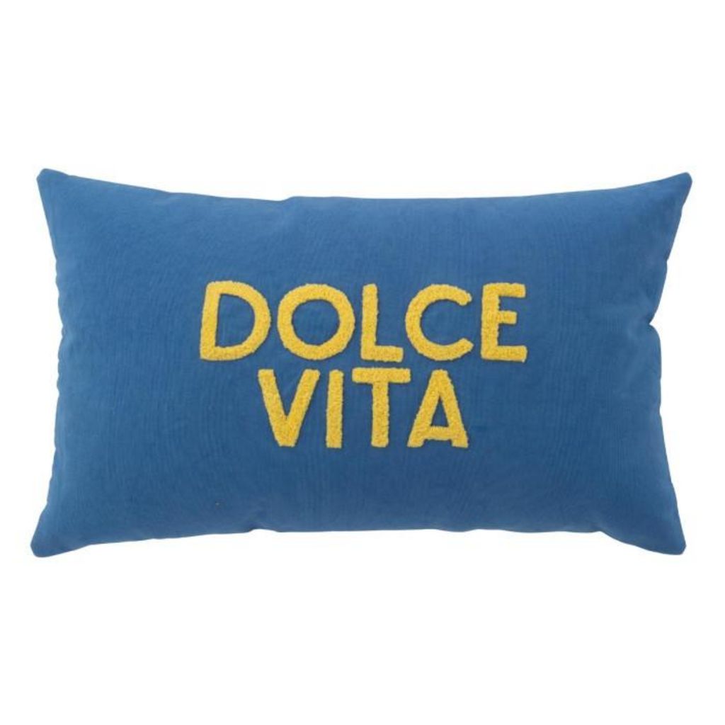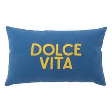 Informations Techniques : Dimensions : L. 50 x l. 30 x H. 10 cm Matières : 95% Coton & 5% Acrylique Spécificités : Déco & Coloré Coussin rectangulaire bicolore Inscription Dolte vita en relief Déhoussable Lavage à 40°C Poids : 0,42 kg Couleur : Bleu & Jaune