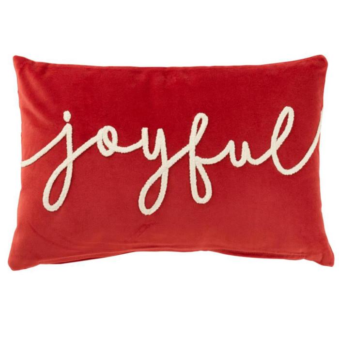 Informations Techniques : Dimensions : L. 45 x l. 30 x H. 12 cm Matière : 100% Velours Spécificités : Festif & Déco Coussin rectangulaire Imprimé Joyful Déhoussable Nettoyage à sec Poids : 0,47 kg Couleur : Rouge