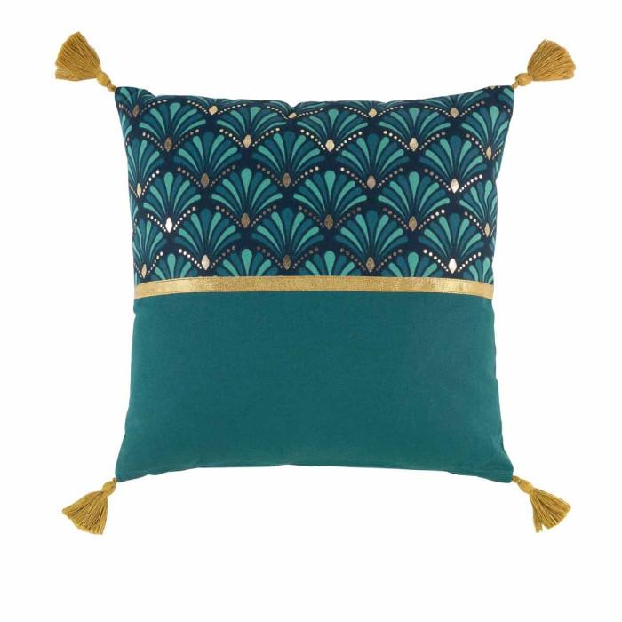 Informations Techniques : Dimensions : L. 40 x l. 40 cm Matière : Coton Spécificités : Doux & Tendance Coussin déco Déhoussable Forme Carrée Avec Pompons Imprimé Métallisé Couleur : Bleu