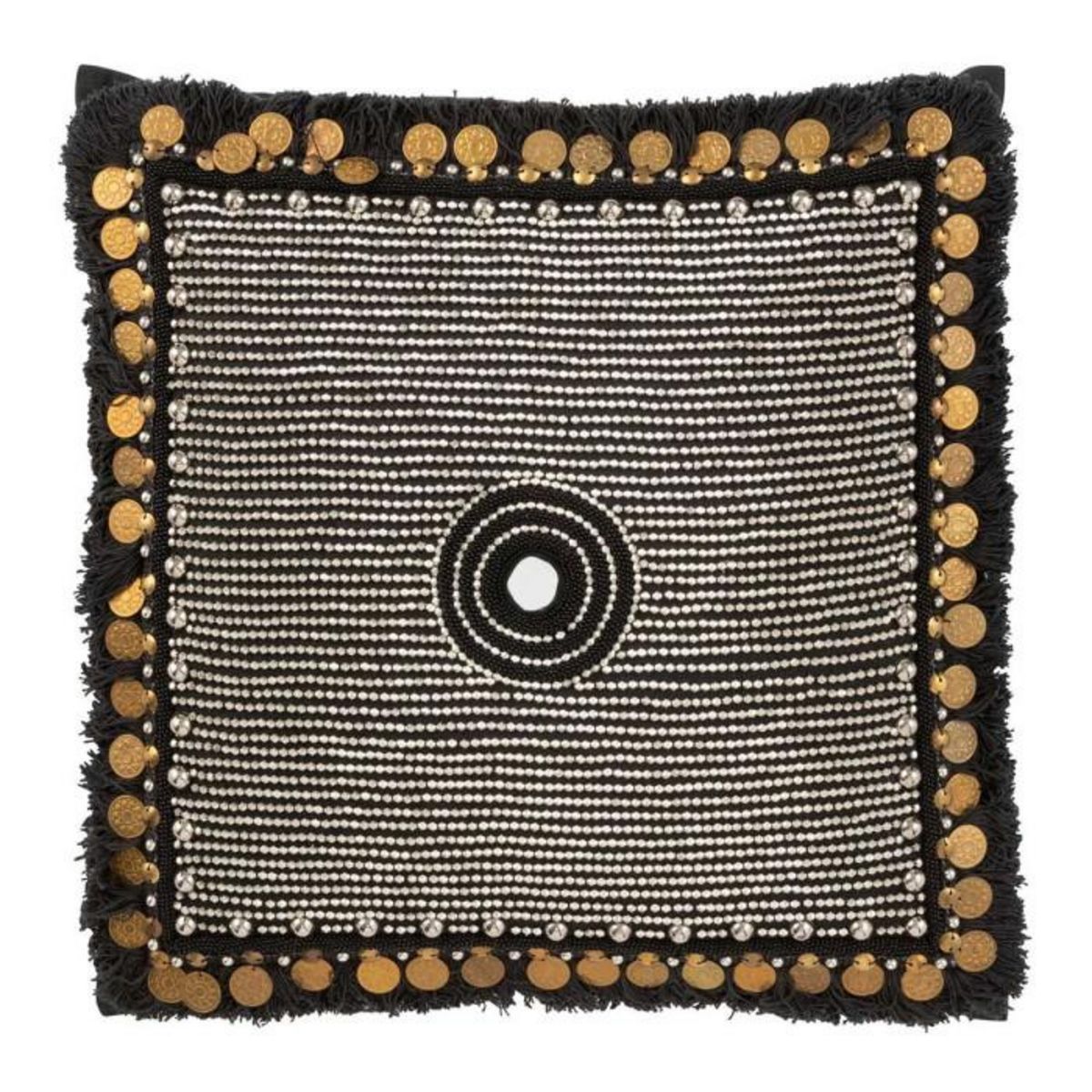 Informations Techniques : Dimensions : L. 45 x l. 45 x H. 10,5 cm Matières : 50% Jute, 25% Coton & 25% Polyester Spécificités : Tendance & Pratique Coussin déco Avec perles Forme carrée Coussin déhoussable Densité : 450 g/cm³ Poids : 0,88 kg Couleur : Noir