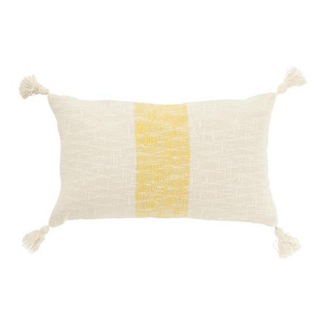 Informations Techniques : Dimensions : L. 50 x l. 30 x H. 15 cm Matière : Coton & Polyester Spécificités : Pratique & Déco Coussin rectangulaire Avec pompons Motif ligne Déhoussable Poids : 0,48 kg Couleur : Blanc & Jaune