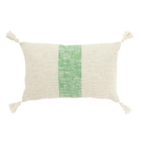 Informations Techniques : Dimensions : L. 50 x l. 30 x H. 15 cm Matière : Coton & Polyester Spécificités : Pratique & Déco Coussin rectangulaire Avec pompons Motif ligne Déhoussable Poids : 0,48 kg Couleur : Blanc & Vert