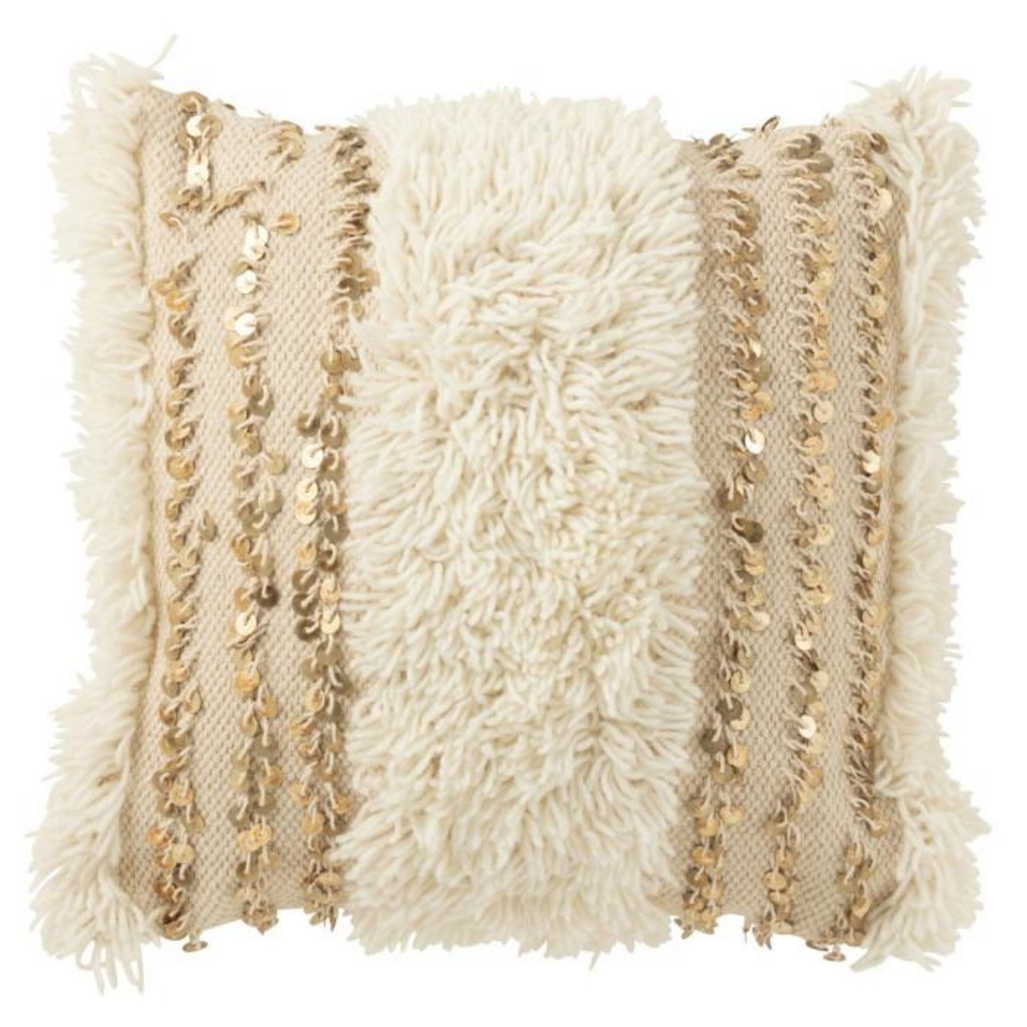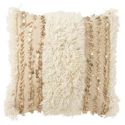 Informations Techniques : Dimensions : L. 45 x l. 45 x H. 12 cm Matières : 60% Coton & 40% Laine Spécificités : Déco & Chic Coussin carré Avec sequins Déhoussable Nettoyage localisé des taches Poids : 0,9 kg Couleur : Crème & Or