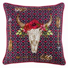 Informations Techniques : Dimensions : L. 45 x l. 45 cm Matière : Coton Spécificités : Original & tendance Finition: Passepoil Coussin déhoussable par fermeture éclair Imprimés: Crâne de buffle, flèches & fleurs Couleur : Rouge