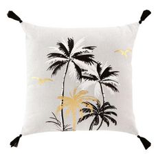 Informations Techniques : Dimensions : L. 45 x l. 45 cm Matières : 71% Polyester, 18% Coton & 11% Viscose Spécificités : Déco & Moderne Coussin carré Avec pompons Imprimé palmier Détails métallisés Déhoussable Label Oeko-Tex Entretien : Lavage à la main Pas de séchage en machine Repassage à 110° Poi