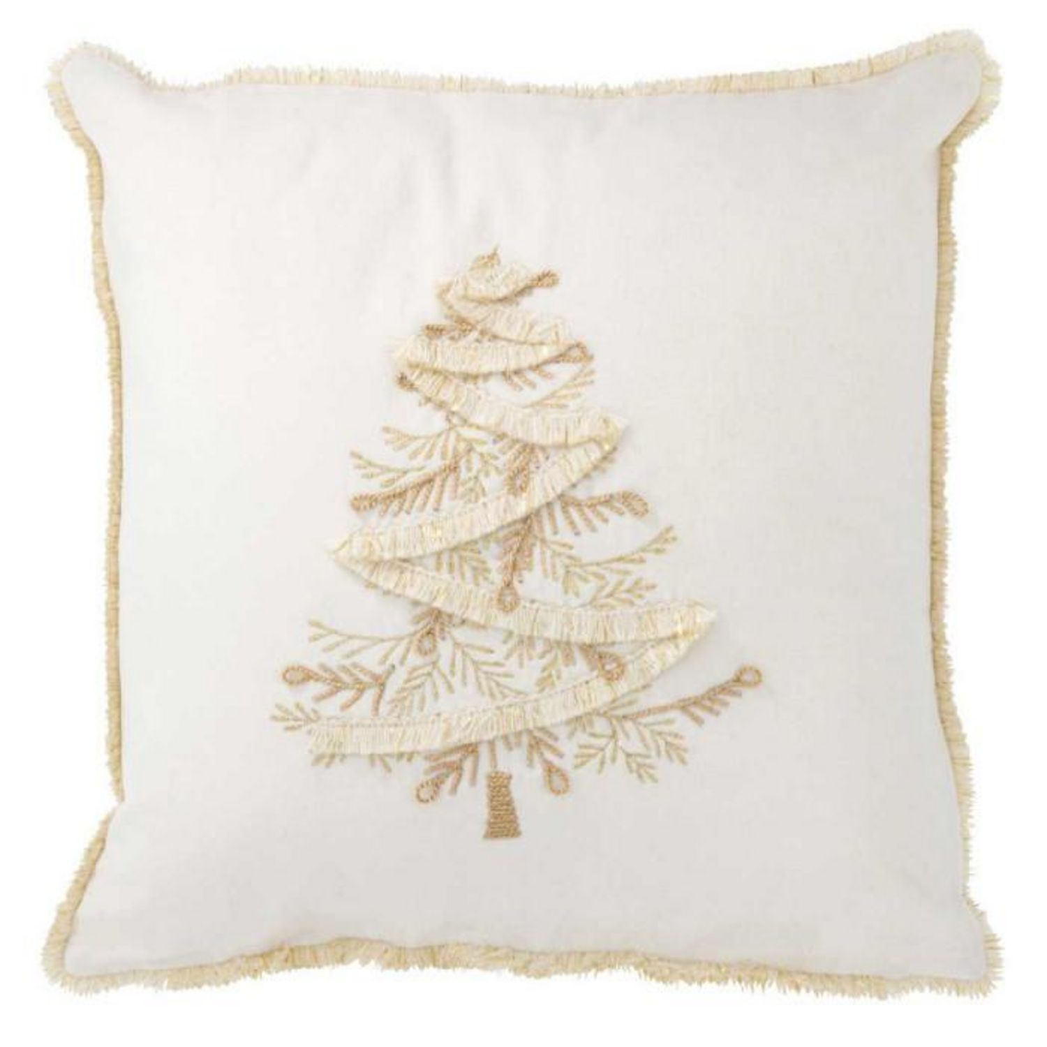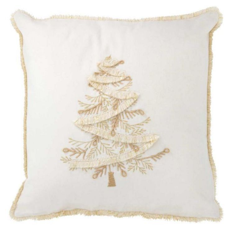 Informations Techniques : Dimensions : L. 45 x l. 45 x H. 3,75 cm Matière : 100% Polyester Spécificités : Déco & Chic Coussin déhoussable Motif sapin Contour avec franges Forme carrée Poids : 0,69 kg Couleur : Blanc & Or