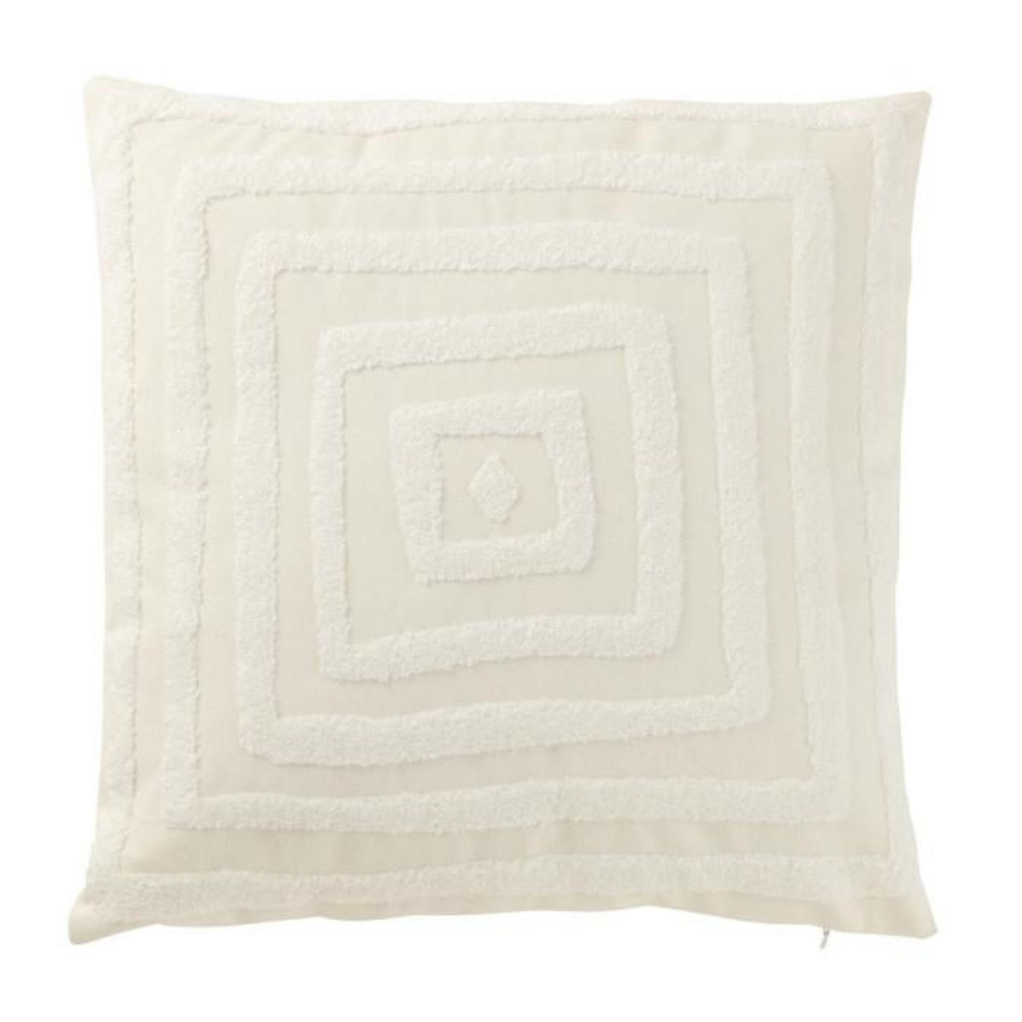 Informations Techniques : Dimensions : L. 45 x l. 45 x H. 13 cm Matière : 100% Polyester Spécificités : Pratique & Tendance Coussin déco Effet tufté Design carrés imbriqués Déhoussable Forme carrée Poids : 0,6 kg Couleur : Blanc