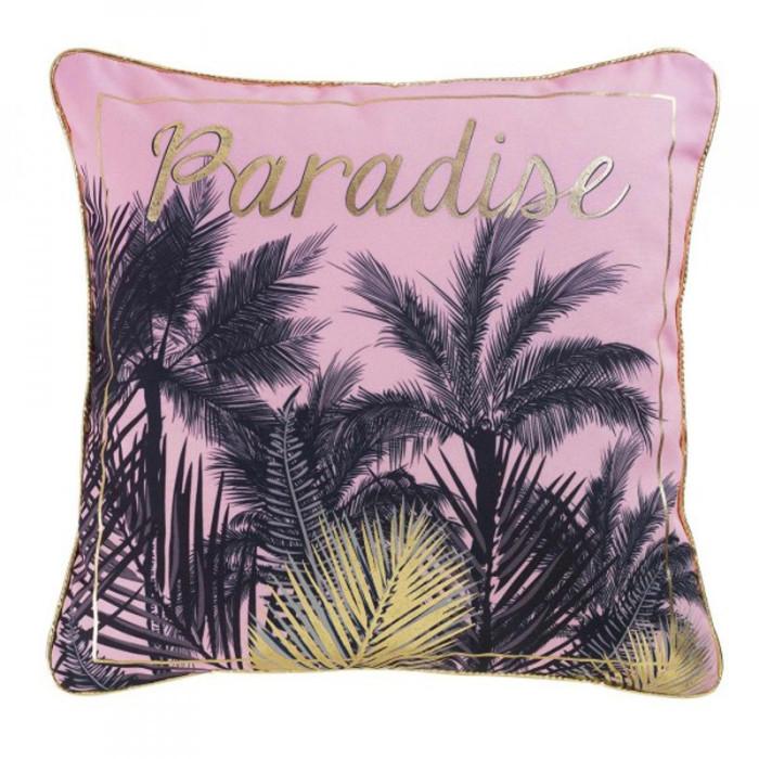 Informations Techniques : Dimensions : L. 45 x l. 45 cm Matière : Polyester Spécificités : Chic & tendance Finition: Passepoil Coussin déhoussable par fermeture éclair Imprimé: Palmiers & feuilles exotiques Couleur : Rose & Noir