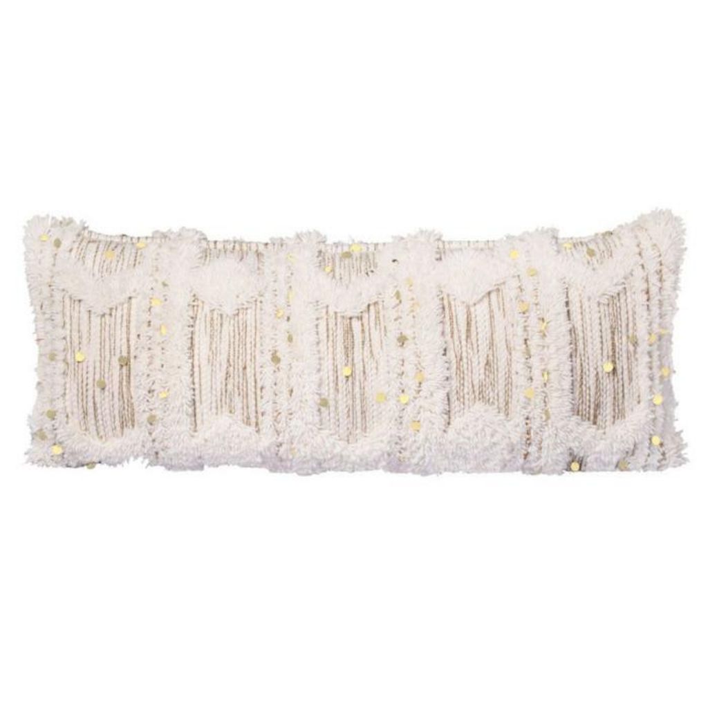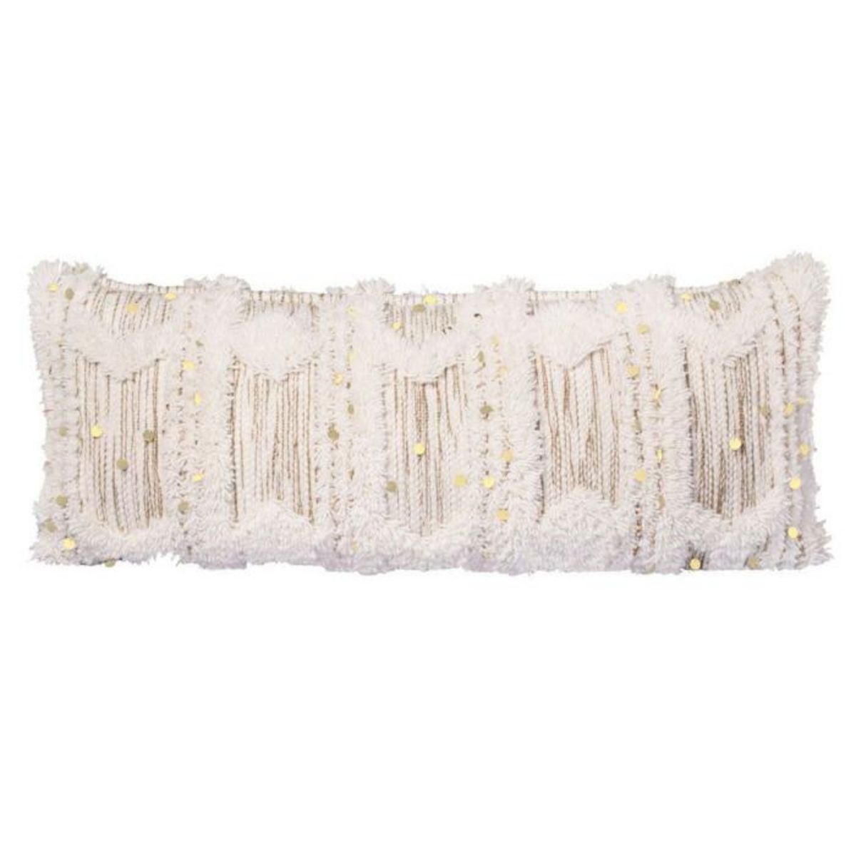 Informations Techniques : Dimensions : L. 35 x l. 95 x H. 20-25 cm Matières : Housse : 92% Laine (Nouvelle-Zélande), 7% Coton & 1% Sequins Remplissage : Polyfibre Spécificités : Résistant & Robuste Coussin Tissé Style Bohème Forme Rectangulaire Avec Franges & Sequins Entretien & Fabrication : Ty