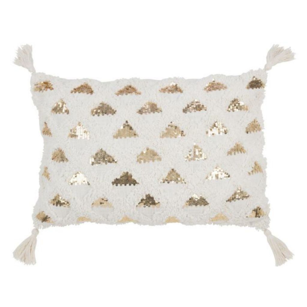 Informations Techniques : Dimensions : L. 60 x l. 40 x H. 12 cm Matière : 100% Coton Spécificités : Pratique & Élégant Coussin déco Effet tufté Motif triangles en sequin doré Forme rectangulaire Poids : 0,85 kg Couleur : Blanc & Or