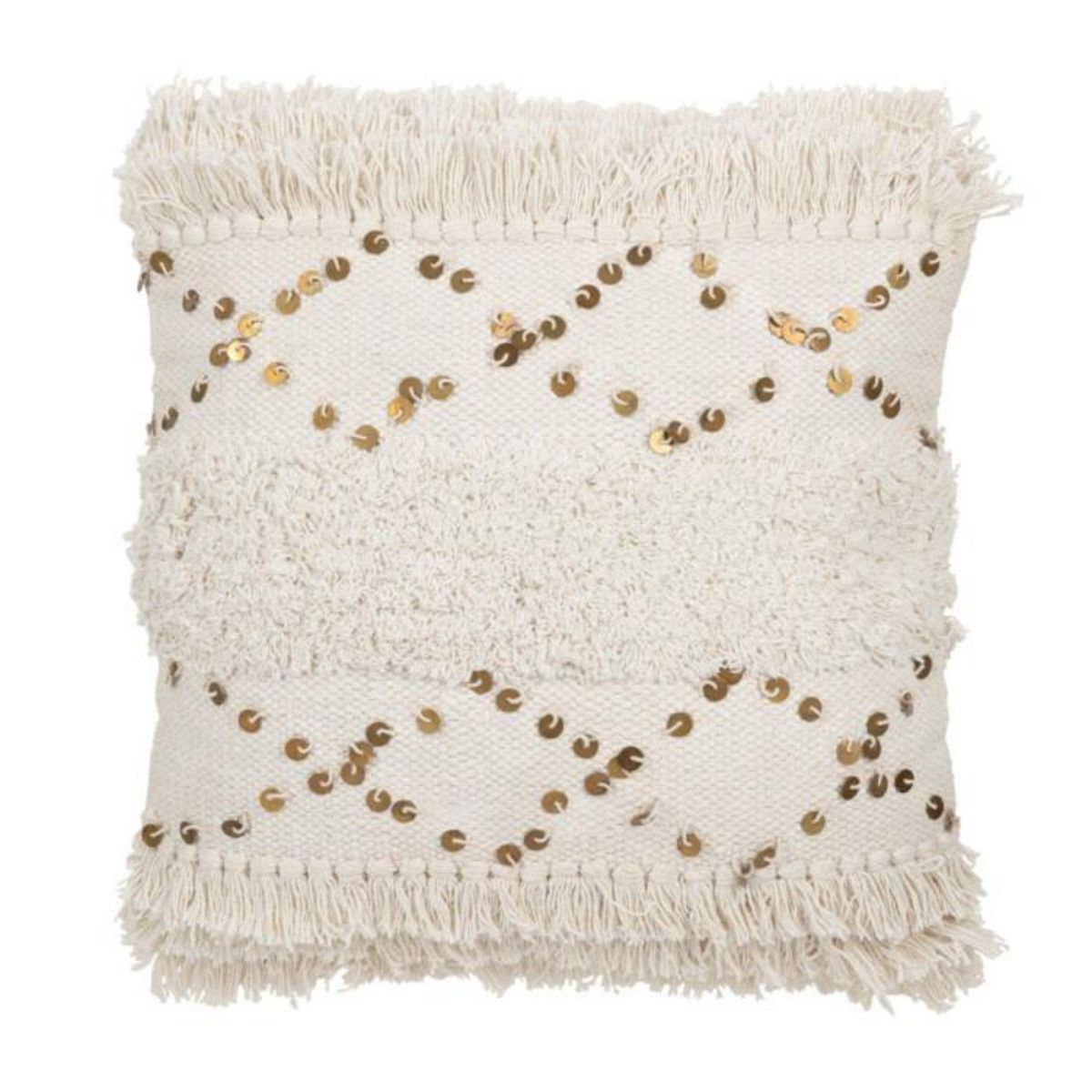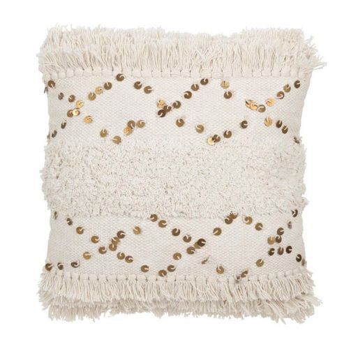 Informations Techniques : Dimensions : L. 45 x l. 45 x H. 12 cm Matière : 100% Coton Spécificités : Pratique & Tendance Coussin déco tufté Avec franges Motif losange en sequin doré Déhoussable Forme carrée Poids : 0,69 kg Couleur : Blanc