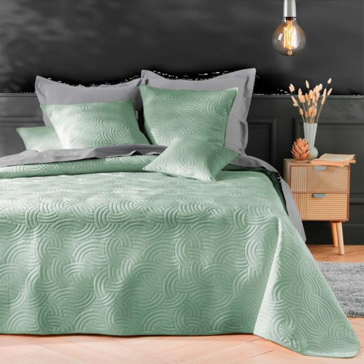 Informations Techniques : Dimensions : Couvre-lit : L. 240 x l. 220 cm Housse de coussin : L. 60 x l. 60 cm Matière : 100% Polyester Spécificités : Doux & Élégant Couvre-lit 2 personnes Avec 2 housses de coussin Motif ton sur ton Tissu velours Certification Oeko-Tex Poids : 2,34 kg Couleur : Sauge