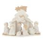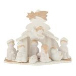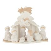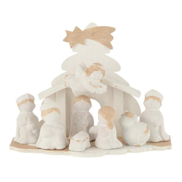 Informations Techniques : Dimensions : L. 25,5 x l. 10,5 x H. 19,5 cm Matières : Bois (Contreplaqué) & Céramique Spécificités : Moderne & Déco Crèche de noël Facile à installer Poids : 0,48 kg Couleur : Blanc & Beige