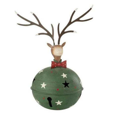 Informations Techniques : Dimensions : L. 27,5 x l. 14 x H. 14 cm Matière : Métal Spécificités : Tendance & Chic Décoration de Noël A Poser Forme Ronde Design Renne avec Clochette Poids : 0,27 kg Couleur : Vert & Rouge