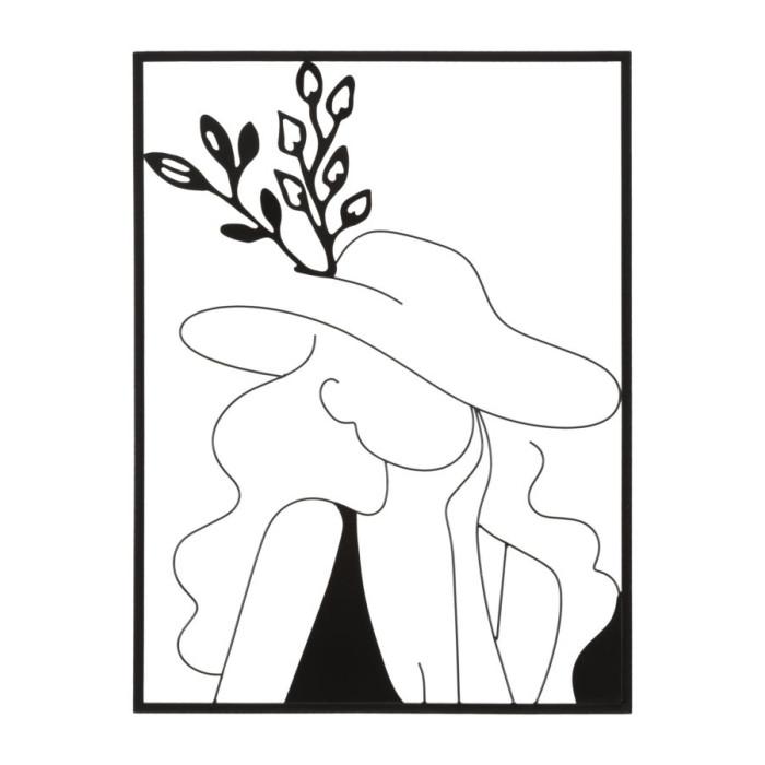 Informations Techniques : Dimensions : L. 60 x l. 1 x H. 80 cm Matière : Métal Spécificités : Élégante & Épurée Déco murale encadrée Design femme avec chapeau Poids : 1,05 kg Couleur : Noir