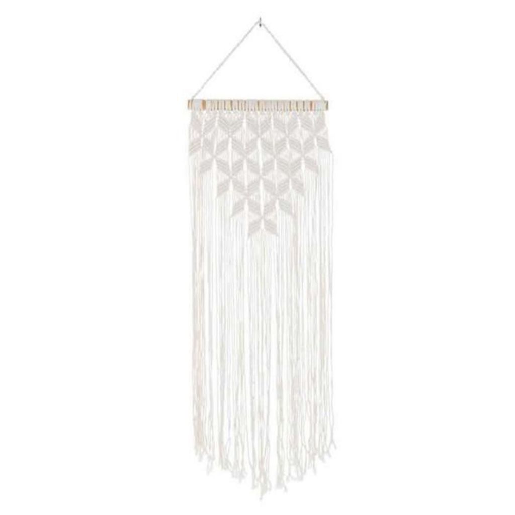 Informations Techniques : Dimensions : L. 38 x l. 4 x H. 95 cm Matières : 90% Coton & 10% Bois (Alabasie) Spécificités : Tendance & Moderne Décoration Murale Forme Rectangulaire Tissage Macramé Couleur : Blanc