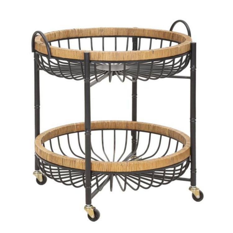 Informations Techniques : Dimensions : L. 57 x l. 55,5 x H. 62,5 cm Matières : Métal & Rotin Spécificités : Pratique & Utile Desserte de cuisine à roulettes Avec 2 paniers Tour en rotin À monter soi-même Poids : 7,7 kg Couleur : Noir & Naturel
