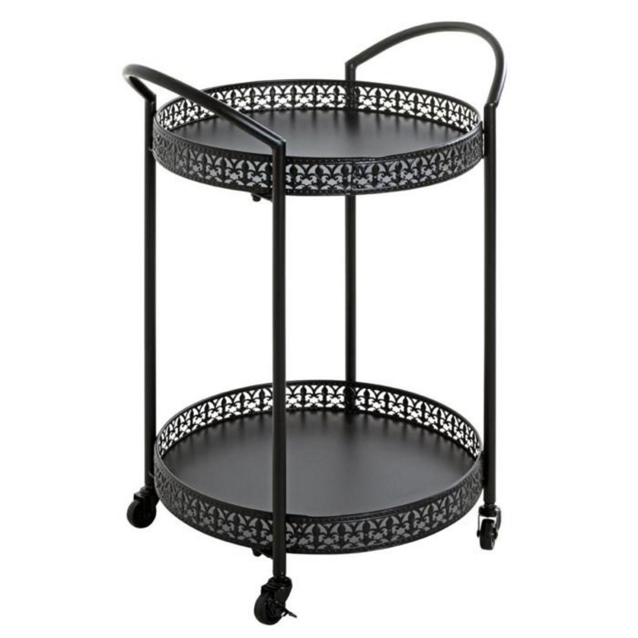 Informations Techniques : Dimensions : L. 51 x l. 42 x H. 71 cm Matière : Métal Spécificités : Pratique & Tendance Desserte de Cuisine 2 Niveaux Sur Roulettes Effet Laqué Livré non monté Nombre de colis : 1 Poids : 4,5 kg Couleur : Noir