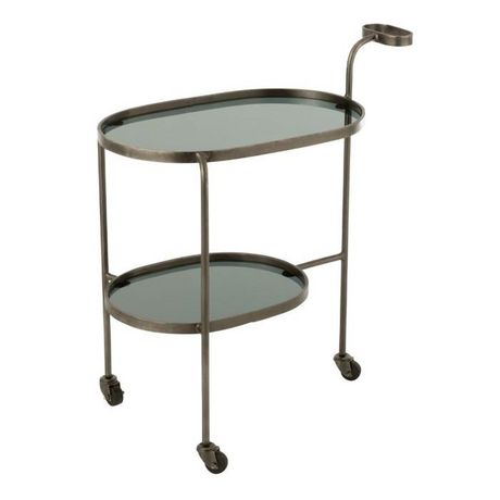 Informations Techniques : Dimensions : L. 74 x l. 42 x H. 84 cm Matières : 70% Métal & 30% Verre Spécificités : Élégante & Vintage Desserte 2 niveaux Avec roulettes Forme ovale Poids max supporté : 15 kg Poids : 12,2 kg Couleur : Gris