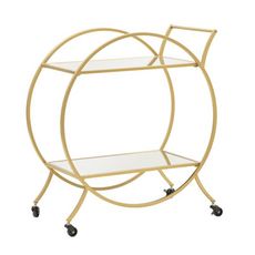 Informations Techniques : Dimensions : L. 70 x l. 36,5 x H. 78 cm Étagères : L. 53 x l. 31 cm Matières : Métal, MDF & Verre Spécificités : Pratique & Utile Desserte à roulettes 2 étages Plateau en miroir Avec une poignée Design rond À monter soi-même Poids : 7,3 kg Couleur : Or