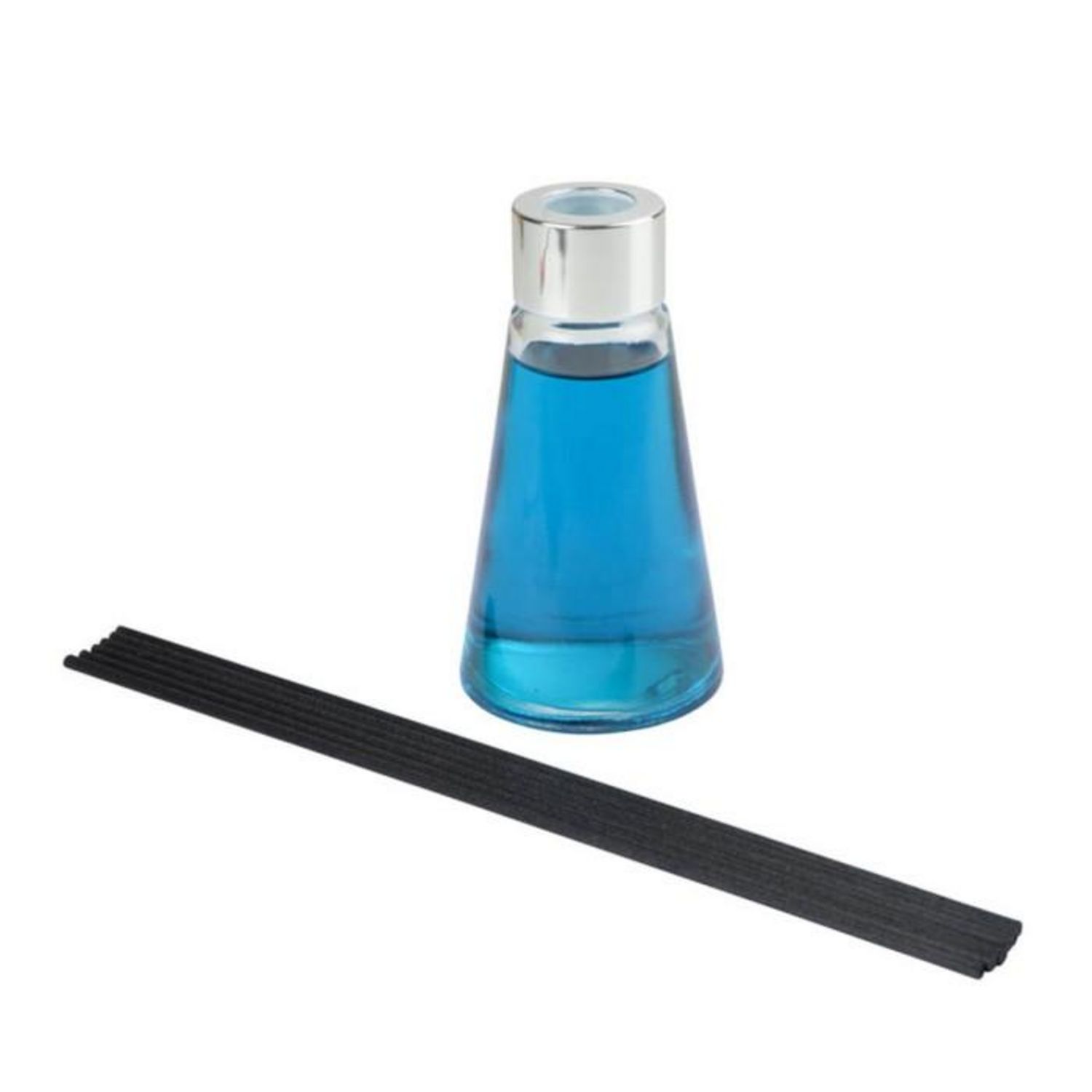 Informations Techniques : Dimensions : Produit packagé : D. 5,7 x H. 22 cm Matière : Verre Spécificités : Tendance & Utile Diffuseur de parfum Avec bâtonnets Contenance : 70 ml Senteur : Lagon Type de fragrance : Tropicale Forme ronde Poids : 0,2 kg Couleur : Bleu