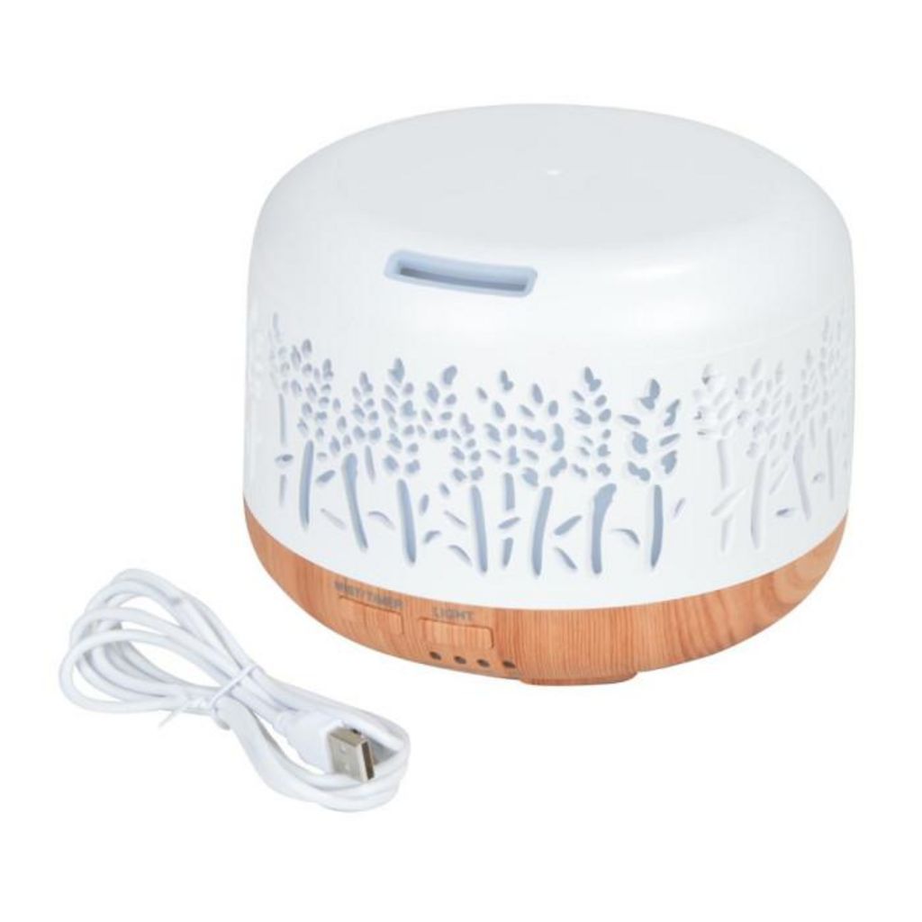 Informations Techniques : Dimensions : D. 13,5 x H. 10,6 cm Matière : Polypropylène Spécificités : Lumineux & Déco Diffuseur de parfum Design ajouré fleurs Base effet bois Éclairage LED Avec câble USB Forme ronde Capacité : 300 ml Poids : 0,28 kg Couleur : Blanc