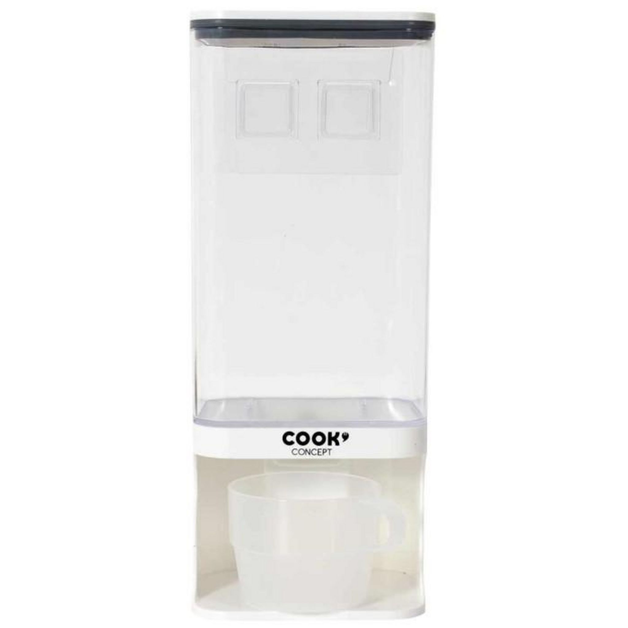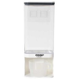 Informations Techniques : Dimensions : L. 12,5 x l. 9,5 x H. 31 cm Matières : Plastique & PS Spécificités : Pratique & Utile Distributeur Aliments Secs Contenance : 1,5L Lave vaisselle : Non Facile d'Utilisation Poids : 0,382 kg Couleur : Transparent & Blanc